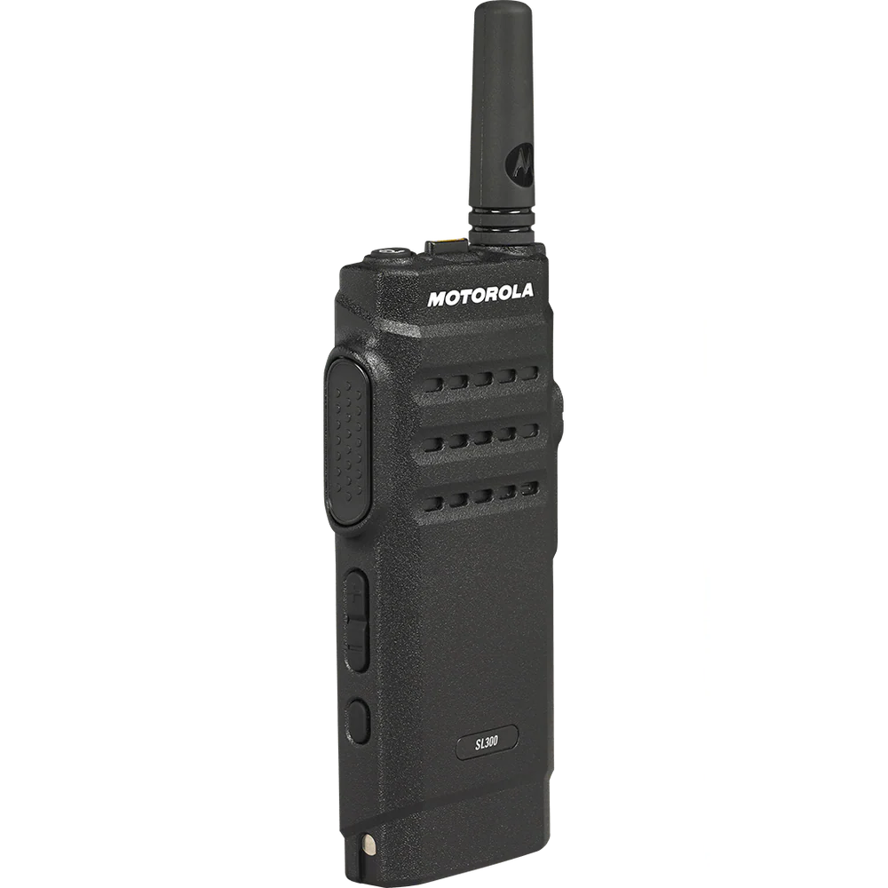 The Motorola SL300 radio is a 2 or 99 channel handheld unit that is ideal for educational institutions, hospitality, events, and retail businesses. The SL300 transmits using analog or digital UHF or VHF frequencies, and can be programmed to work with other Motorola, Icom, and Kenwood analog or digital radios.